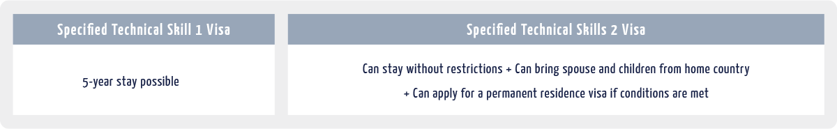 If you obtain a Specified Technical Skills I visa, you can stay in Japan for a limited period of five years.