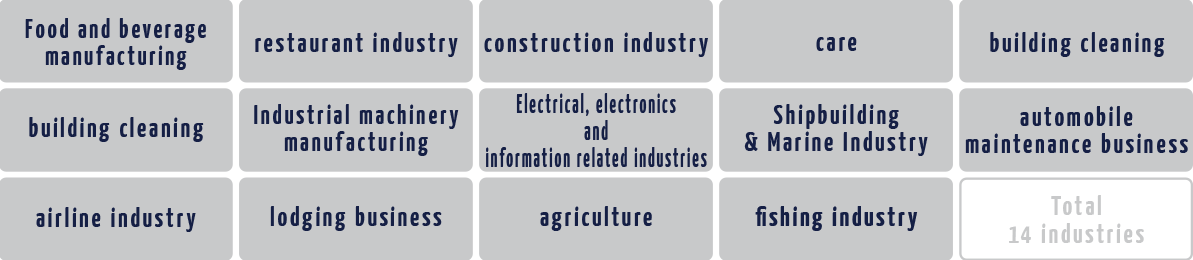 In these 14 fields, efforts to secure human resources in Japan are already underway, but even so, a long-term shortage of manpower is expected, so it has been decided to seek the help of foreign human resources. The fields that have been designated as specific industrial fields are as follows.