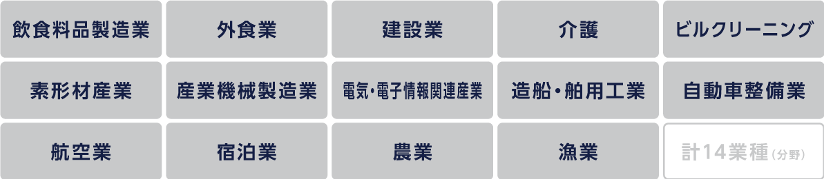 その14分野では既に国内での人材確保の取り組みは進んでいますが、それでも長期的な人手不足が予想される為、外国人材の力を借りることになったのです。特定産業分野とされている分野は、以下の通りです。